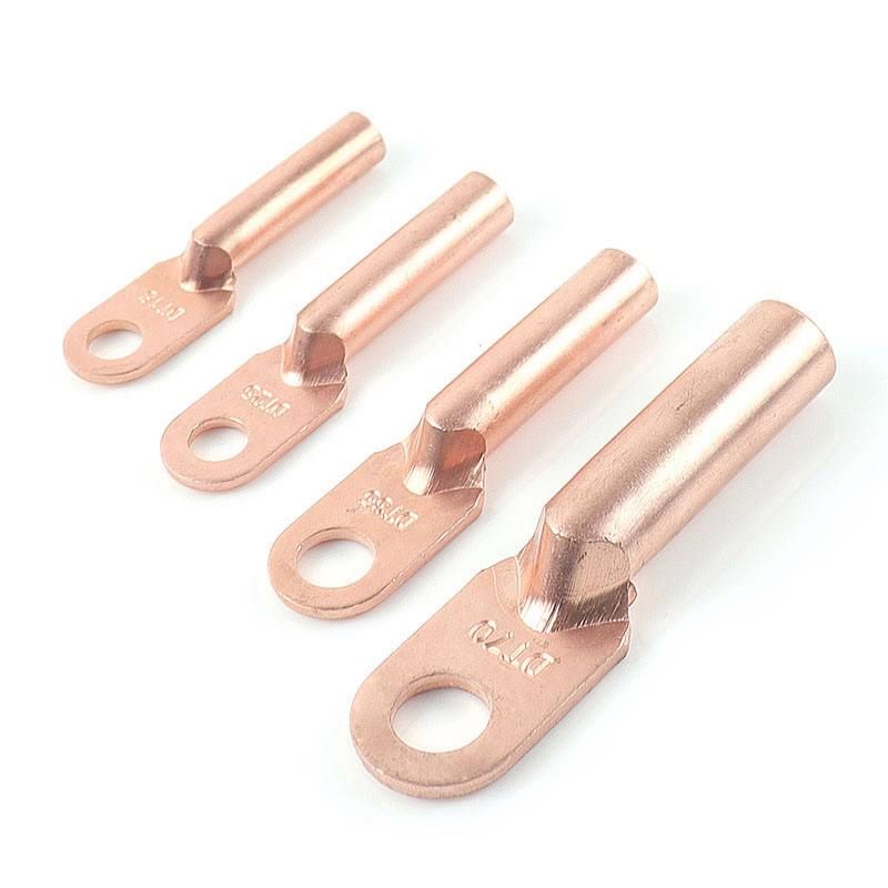 在市面上所见到的一些连接器铜端子,这种连接器铜端子的材质一般是紫铜、黄铜或者磷青铜车制,产品外貌为锅铲圆头,顶端这边为固定上螺丝边,末端为上剥皮后的电线电缆铜芯,它的品种分为堵油式和管压式。
